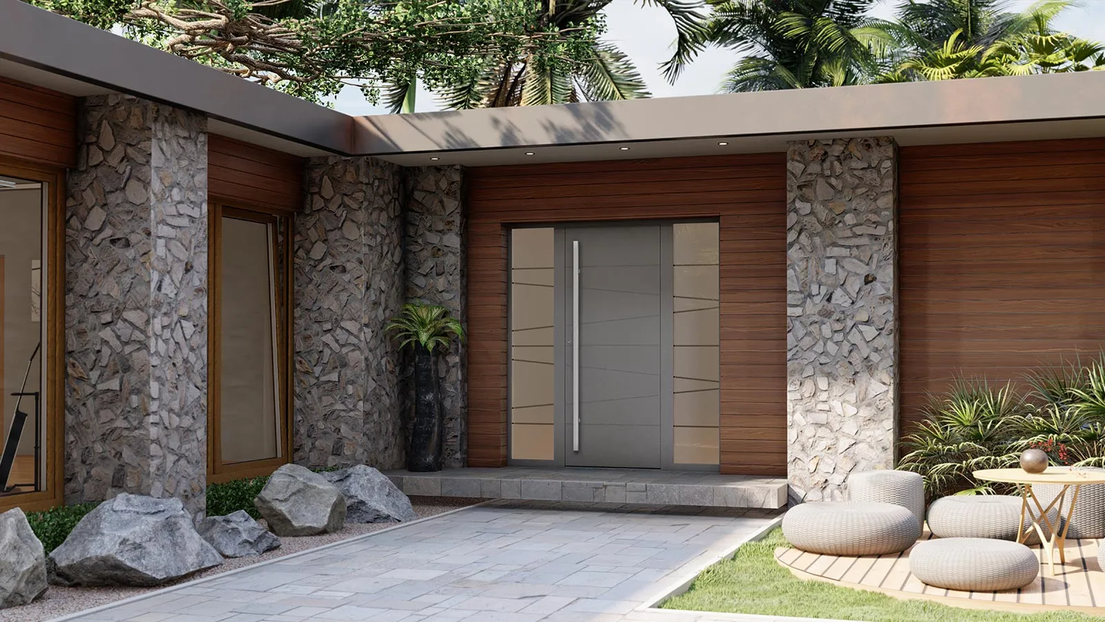 Profile mają budowę trójkomorową o głębokości konstrukcyjnej kształtowników drzwi wynoszącej 77 mm, z przegrodą termiczną wykonaną z poliamidu wzmocnionego włóknem szklanym.