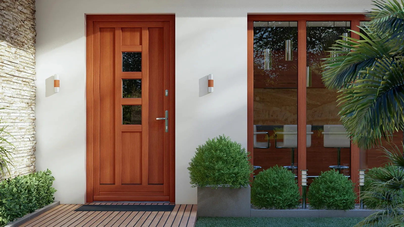 Drzwi drewniane wykonane z najwyższej jakości drewna, klejonego trójwarstwowo, o grubości 68 mm, które jest podstawą klasycznego wzornictwa, wysokiej trwałości i stabilności drzwi oraz najwyższej jakości wykonania. Drzwi drewniane zewnętrzne Drutex to jednak nie tylko elegancki design i wyrafinowany wygląd, ale również doskonała izolacja. W standardzie drzwi wyposażone są w próg aluminiowy z przekładką termiczną, co wpływa pozytywnie na parametr izolacji cieplnej całego systemu.